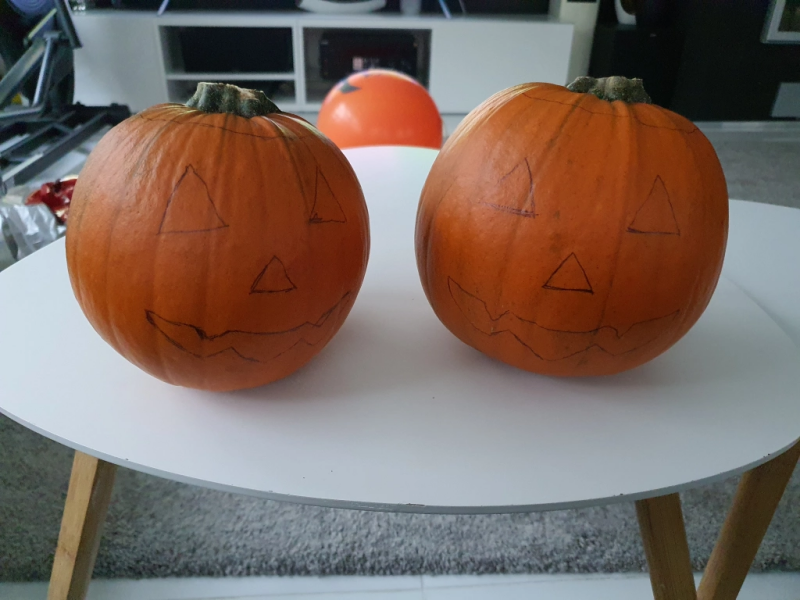 Ensin piirsin kuulakärkikynällä kasvot molemmille kurpitsoille.
