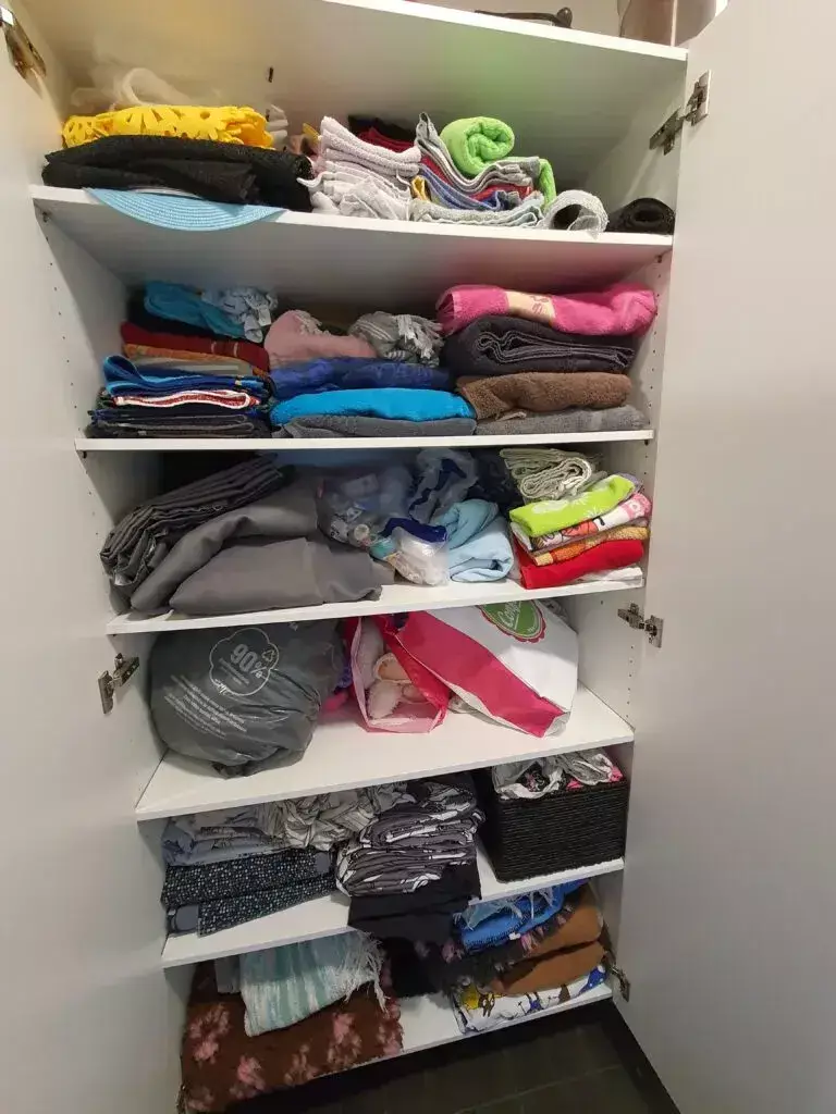 Olemme ystäväni, tulevan ammattijärjestäjän kanssa käyneet nyt läpi meidän kodinhoitohuoneen, josta tämä yhteistyöprojekti sai alkunsa. Kodinhoitohuone oli meidän kodissa selkeä ongelmapiste. Sinne kertyi pöydille jos jonkinlaista tavaraa, pyykkiä ja purnukkaa. Ensin kävimme läpi liinavaatekaapin, jossa meillä säilytettiin petivaatteet, pyyhkeet, verhot, pöytäliinat ja erilaiset viltit ja pienet matot. Ja koska hyllyille oli jäänyt raivauksen välissä tyhjää tilaa, olin piilottanut sinne pussessa lasten syntymäpäiväkoristeita, koska niille ei ollut meidän kodissa tilaa eikä omaa paikkaa 😅.